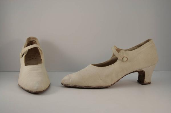 Scarpa con tomaia in tela beiges, realizzata in tre pezzi, con punta a punta e cinturino sul collo del piede chiuso da un bottone rivestito in tessuto e un occhiello. Fodera e soletta in tela di cotone. Suola in cuoio che continua anche sul tacco a coda foderato in tela di cotone.