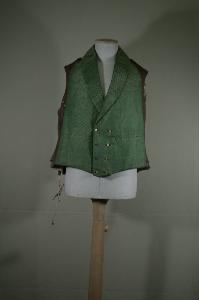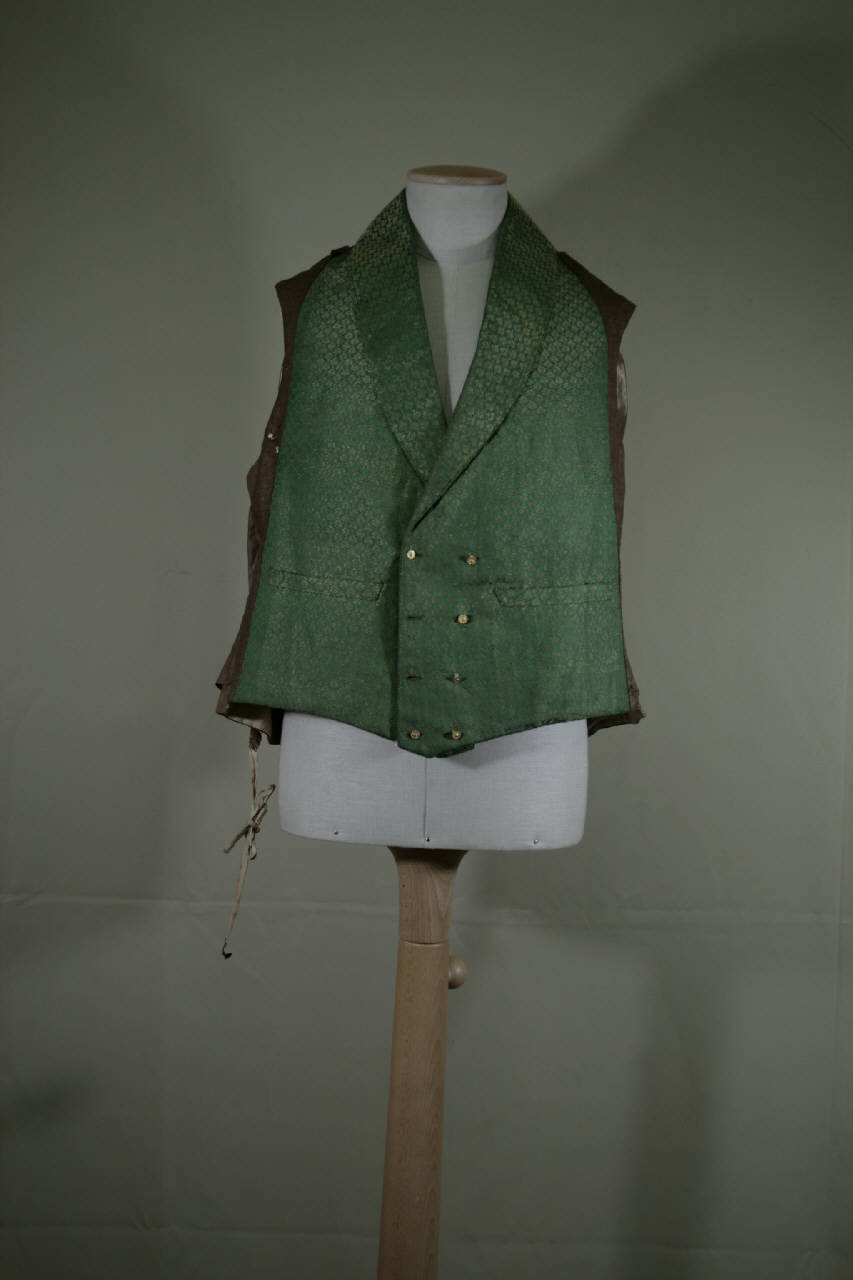 Gilet maschile a doppio petto, collo sciallato e due tasche con patte cucite, otto bottoni in metallo dorato e quattro occhielli. E' confezionato in taffetas verde lanciato in oro riccio: la ttrama supplementare crea un motivo zig-zag. Fianchette e dorso in un pezzo in tela cerata marrone. Fodera in diagonale di cotone garzato. .