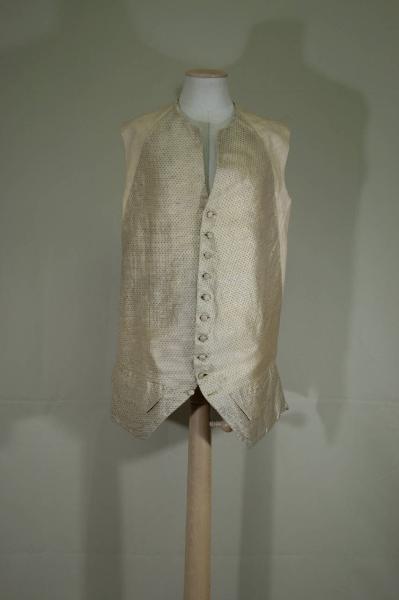 Gilet in diagonale (ordito bianco e trama crema) laminato in argento lamenllare e lanciato in seta rosa e nero; le trame lanciate creano un motivo piccoli motivi a pois disposti a scacchiera. Collo a girocollo, mostre dritte dove sono dodici bottoni rivestiti in tessuto e altrettanti occhielli, tasca con patta sagomata. Falde sfuggenti verso il dorso con cucitura centrale in tel di cotone garzato, usato anche per la fodera. Fianchi e parte del dorso, in corrispondenza del giro manica, in tela di lino rosacea.