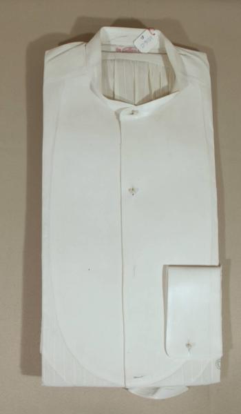Camicia maschile confezionatain pekin di cotone, con collo a cinturino con tre occhilli, sparato in tela apprettata con quattro occhielli, da cui parte un piccolo cappio con occhiello, apertura completa con un bottone e un occhiello. Piccolo sprone sul retro, da cui parte una arricciatura. Maniche lunghe con polsino apprettato con due occhielli e spacco chiuso da un occhiello. Sul lato sinistro, sotto lo sprone, è ricamata l'iniziale in cotone grigio M e O. La camicia conservano la phiegatura originale.