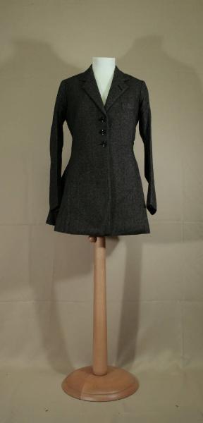 Redingote ad un petto in spigato di lana grigio con collo con risvolti, chiusura definita da tre bottoni e altrettanti occhielli, è modellata da tagli che danno volume e ampiezza alle falde lunghe fino ai fianchi; dorso modellato da fianchette, con cucitura centralre che forma uno spacco. Maniche lunghe in due pezzi sagomate, con al polso tre bottoni. Tasca con patta cucita sul petto, a sinistra. Fodera in diagonale nero e bianco per il dorso e le maniche.