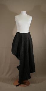 Gonna sagomata atta a coprire i calzoni, confezionata in spigato di lana grigio, cucita ai fianchi, con abbottonatura nascosta definita da quattro bottini e altrettnti occhielli e un gancio, tasca interna; un pannello avvolgeva le gambe, con pinces all'altezza del ginocchio, per chiudersi mediante bottoni e occhielli. La gonna è parzialmenet foderata in diagonale grigio