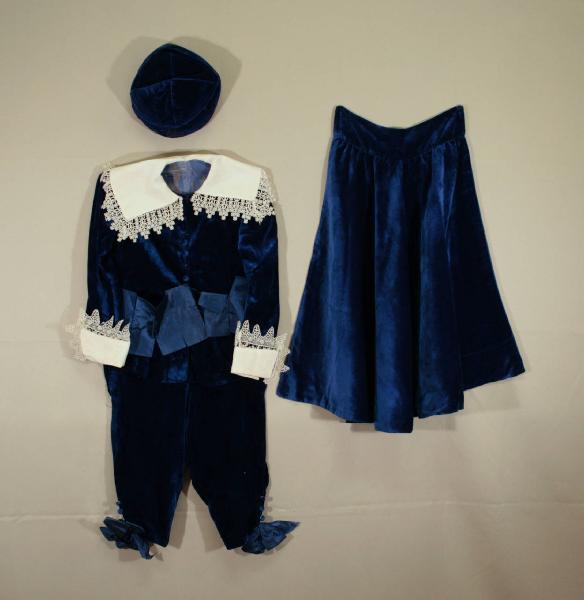 Completo in quattro pezzi in velluto azzurro, Calzoni aperti ai fianchi, con bottoi in madreperla cuciti all'altezza della vita; calzone con spacco al ginocchio, chiuso da tre automatici e impreziositi da quattro bottoni rivestiti in velluto no funzionali e da fiocco in tafetas sintetico blu. Mantello corto, arricciato allo scollo, con collo semplice; fodera in raso blu. Giacca chiusa anteriormente mediante unidi automatici e decorata con nove bottoni rivestiti in tessuto non funzionali; falde svasate, manica lunga dritta in un pezzo, con alto polsino applicato in tela di cotoe biancom bordato con un merleeto bianco; gli stessi materiali sono impiegati per il collo bavero; fodera in diagonale di seta blu. Cappello con calotta definita da quattro spicchi e tesa rialzata, su cui è ricamato uno stemma in cordoncino dorata e canutiglia e sotto un motto; fdera in diagonale di cotone rosso con imputure meccaniche.