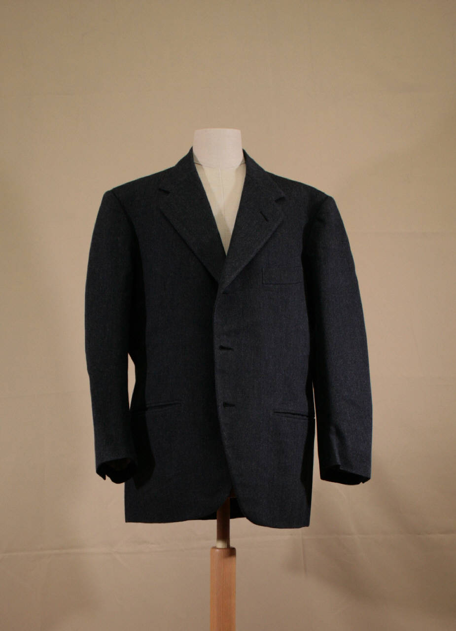 Completo composta da giacca, pantaloni e gilé in diagonale di lana grigio antracite. Giacca ad un petto, tre bottoni e tre occhielli, collo con risvolti con occhiello, modellata da pinces, due tasche a filetto e taschino co patta cucita sul petto, fianchetta e dorso con cucitura centrale terminante con spacco. Maniche in due pezzi con spacco sulla manica con tre bottoni e altrettanti occhielli. Fodera in diagonale di seta nero e maniche in taffeas bianco. Tasca interno con filetto e patta e spalle imbottite. Gilé ad un petto, chiuso da cinque bottoni e altrettanti occhielli, con quattro tasche con patta cucita, modellato da pinces, dorso in due pezzi con cucitura centrale che termina con spacco e cinturibno in diagonale di seta nero (sul cinturino è applicata l'etichetta) ; fodera in tela di cotone bianco stampato a righe. Pantalone lungo classico con risvolto, con cintura, due coppie di pinces aperte, tasche inserite nella cucitura dei fianchi ed uno a sx, all'altezza della vita; chiusura nascosta mediante patta dove sono quattro bottoni e altrettanti occhielli e un gancio; altri due bottoni sulla cintura; sul dietro pinces chiuse e due tasche a filetto. Etichetta applicata sulla fodera della tasca; sulla cintura, rinforzata con un nastro bianco, sono cuciti sei bottoni.