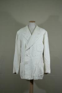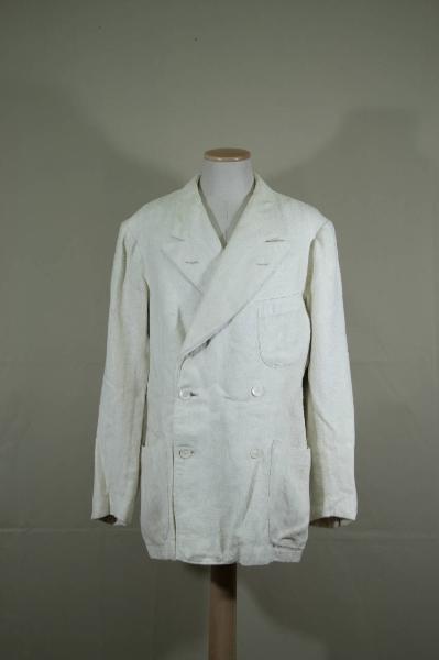 Completo composto da giacca e pantaloni in bourette di seta. Giacca doppiopetto, 4 bottoni e 4 occhielli, collo con risvolti a lancia con occhiello, modellata da pinces, tre tasche applicate; dorso con cucitura centrale. Maniche in due pezzi con spacco sulla manica con 2 bottoni e altrettanti occhielli. Fodera parziale del dorso e delle maniche in taffetas avorio. Tasche interne con filetto e patta e spalle imbottite. Pantalone lungo classico con risvolto, con cintura e passanti, 4 pinces aperte, tasche inserite nella cucitura dei fianchi; chiusura nascosta mediante patta dove sono quattro bottoni e altrettanti occhielli e un gancio; un altro bottone è sulla cintura; sul dietro pinces chiuse e due tasche a filetto.