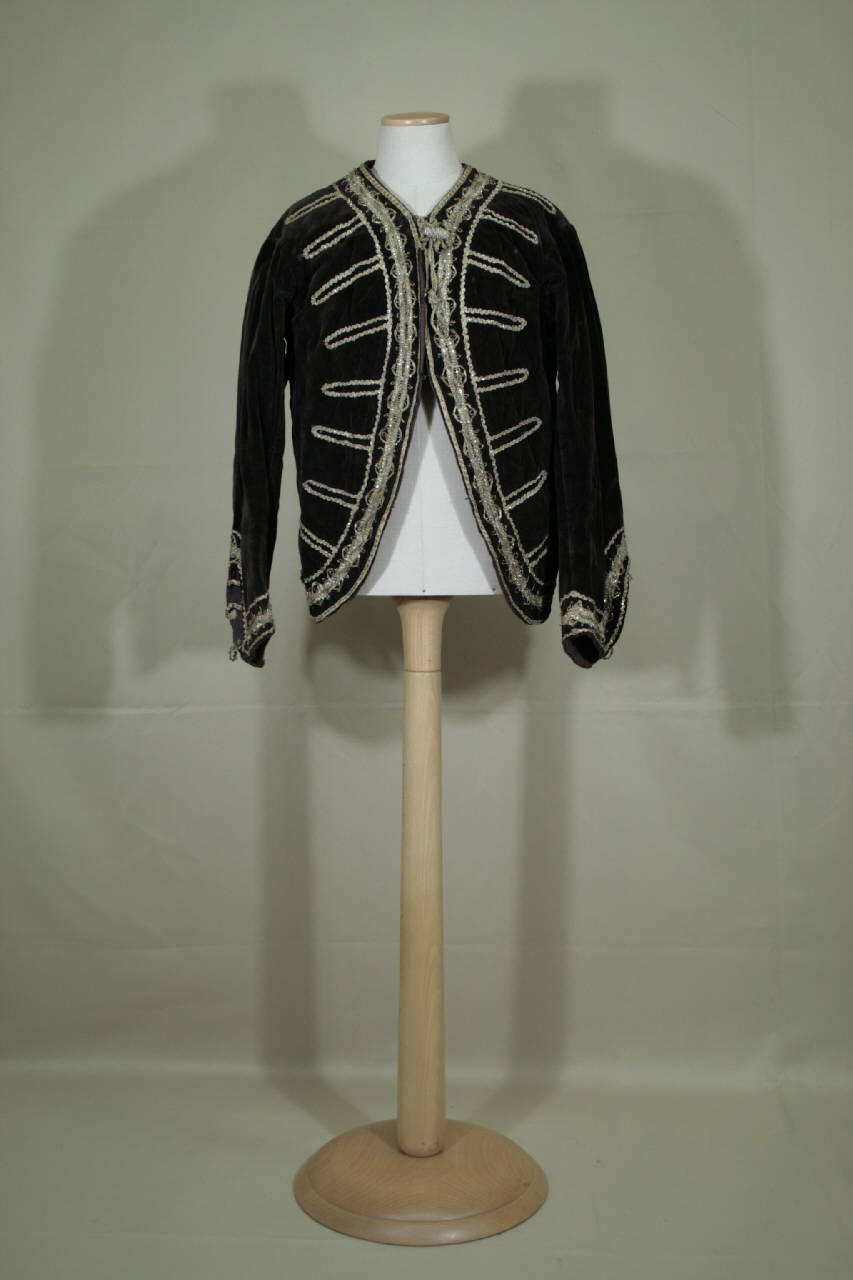 Giacca ad un petto, in velluto marrone. Scollo a girocollo, apertura anteriore sagomata e arrotondata, linea della spalla arrestrata, fianchetta si uniscono al dorso con falda morbida, cucitura centrale. Maniche diritte in un pezzo con polso arrotondato. Galoni in oro filato bordano lo scollo, l'apertura anteriore, l'orlo, il polso e i tagli sul dorso e definiscono otto coppie di finti occhielli. Chusura definita da un alamaro. Tre galloni chudono l'apertura del polso. Fodera in tela di lana cangiante (ordito marrone e trama viola), mentre dorso e maniche in tela di lino marrone.