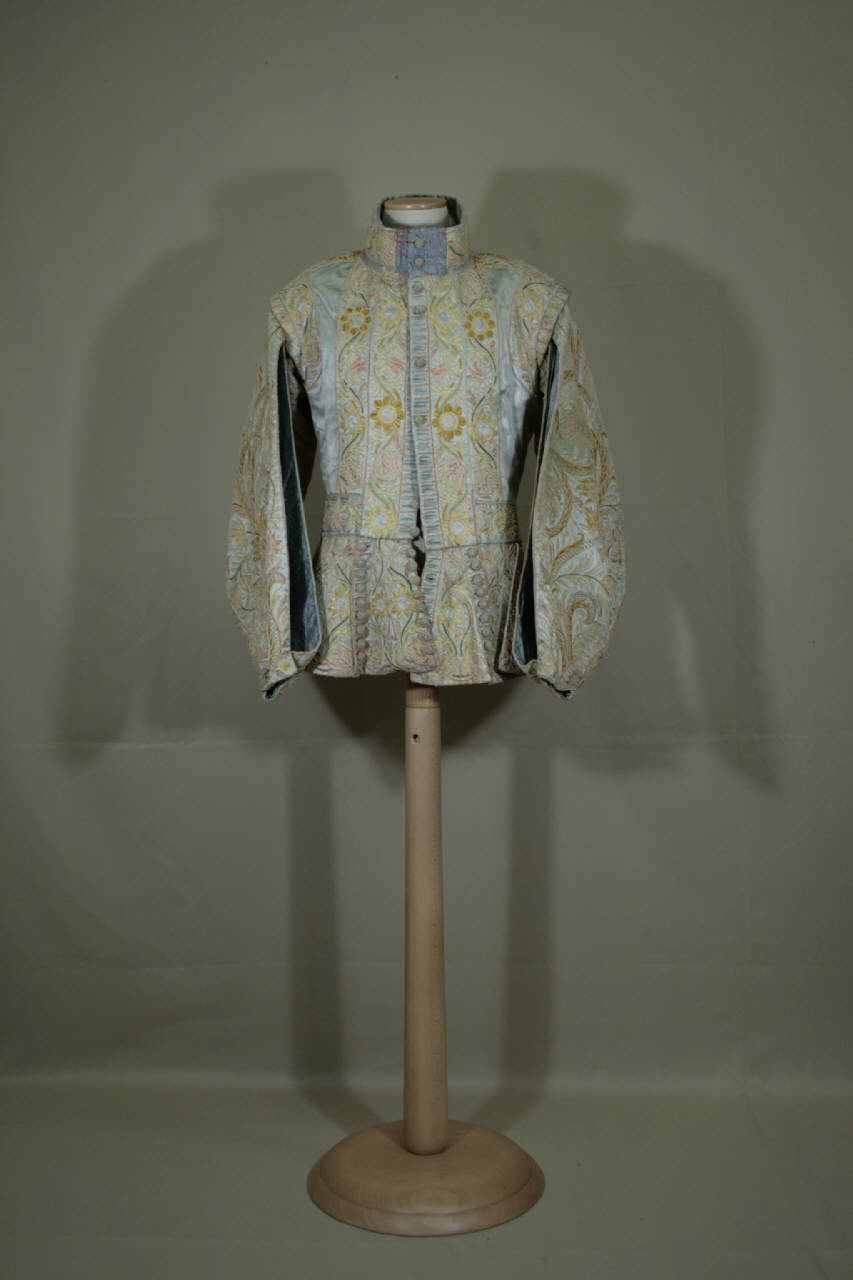 Giubba confezionata in raso di sea celeste ricamata a motivi floreali disposti in volute e girali per le maniche decorative e disposti in bande per il corpo. Collo a cinturino, apertura anteriore competa centrale definita da ventuno bottoni decorti da un merletti in lino écru, le due aperture sono decorati da numerose asole sia funzonali che decorative. Taglio in vita, sottolineato da un motivo a finta cintura, da cui parte la falda suddivisa in cinque faldine svasate, di cui le due anteriori centrali sono decorate da bottoni (dieci) e occhielli (dieci). Dorso ripartito come il verso. Grandi maniche decorative con apertura anteriore, co n spacco al polso chiuso da tre bottoni. Fodera in taffetas celeste e il dorso in tela di lino marrone. Per il collo sono stati impigati due farmmnti di raso celeste brocato in seta e decorato da tralci bianch e fiori verdi.