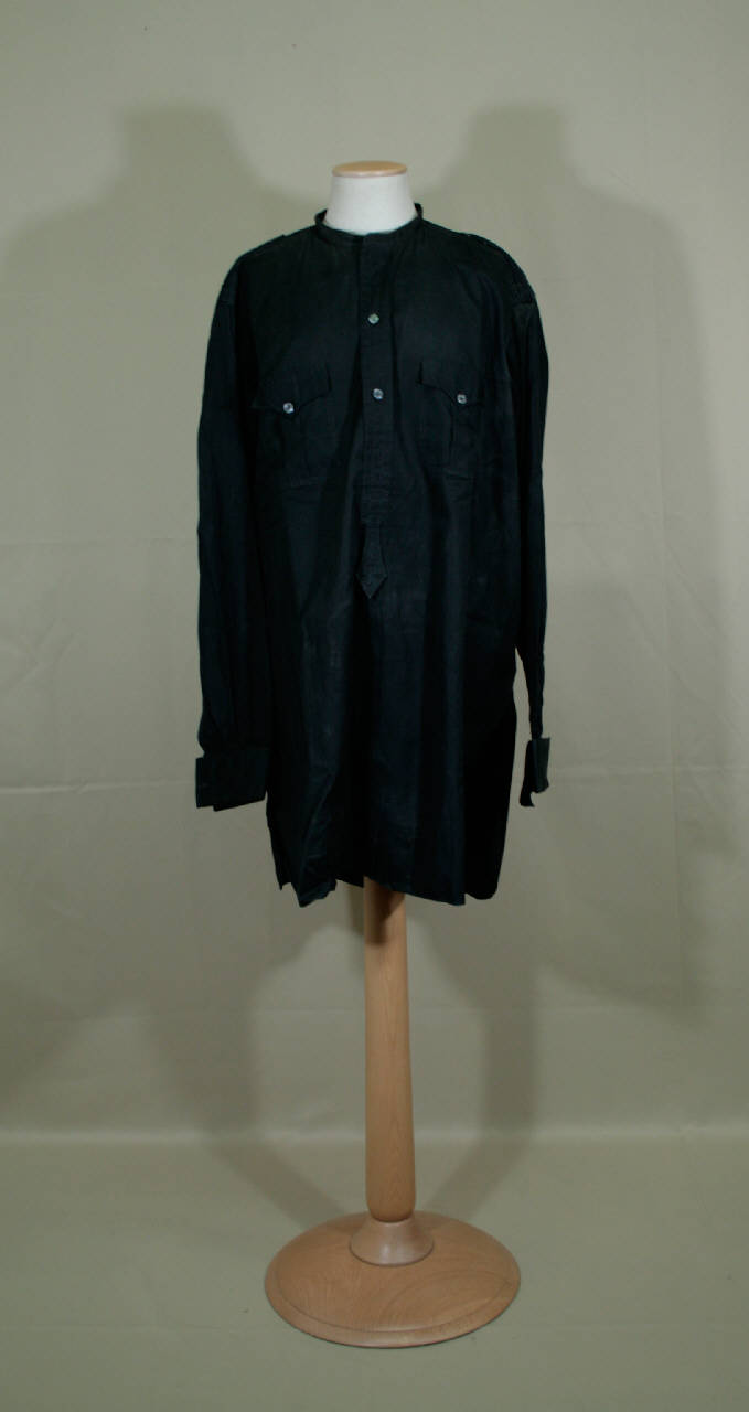 Camicia maschile confezionatain in tela di cotone nera, collo a cinturino con tre occhielli, abbottonatura parziale data da due bottoni e altrettanti occhielli; dall'abbottonatura parte un passante sagomato con due occhielli e una piega piatta. All'altezza del petto sono applicate due tasche con patte sagomate. Piccolo sprone sul retro da cui partonodue pieghe piatte. Spallini sagomati chiuso da un botton con asola. Orlo dei fianchi stondati,nManiche lunghe con polsino ripiegato con quattro occhielli e spacco chiuso da un bottone con occhiello. Etichetta all'abbattonatura.