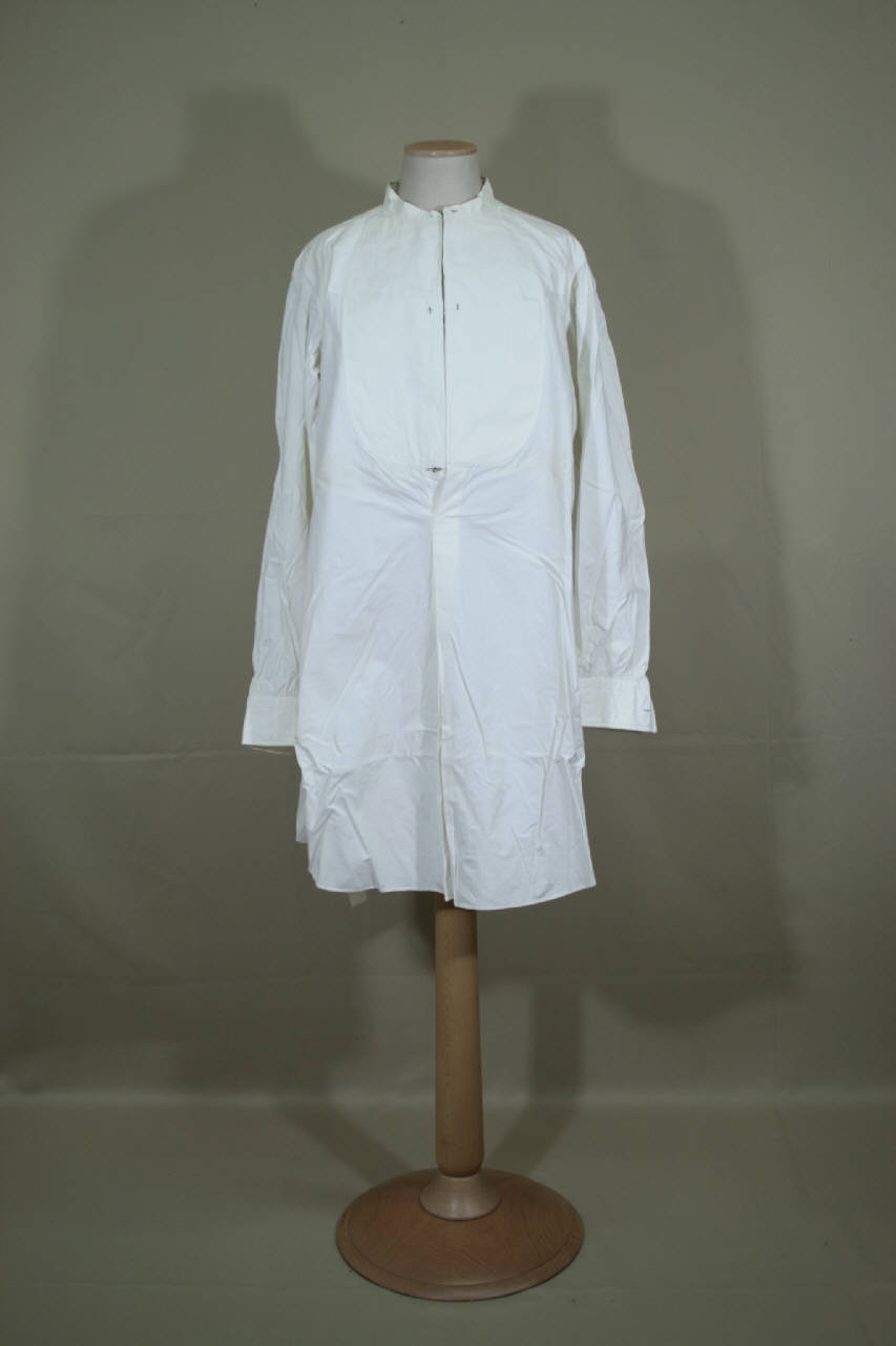 Camicia maschile in tela bianca con collo a cinturino con tre occhielli, sprarato inamidato data da due occhielli e abbottonatura parziale terminante con un piccolo cappio sagomato con due occhielli e monogramma in cotone rosso, piccolo sprone sia anteriormente che sul retro, su cui è applicato un passante sul rovescio, e che trattiene una ricca arricciatura. Orlo dei fianchi stondati. Maniche lunghe blusanti con gherone e polsino con due occhielli e spacco.