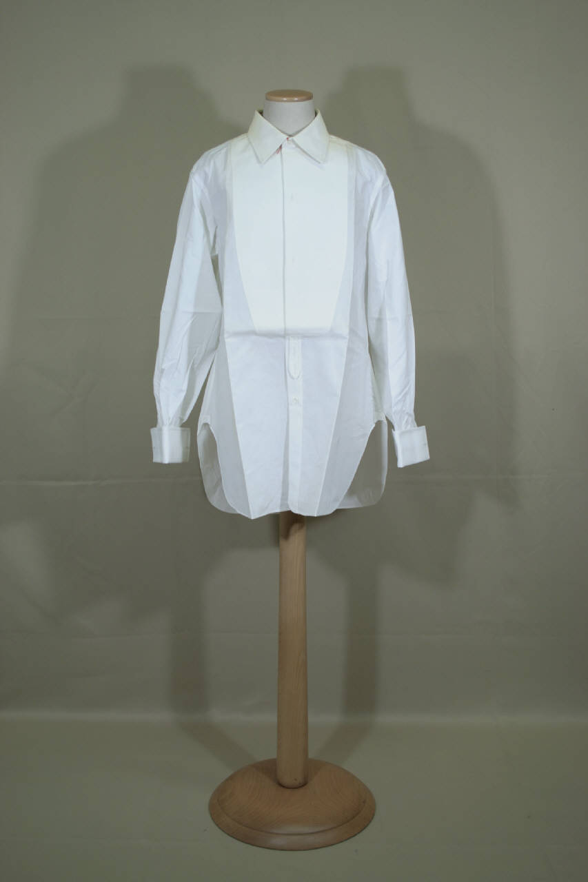 Camicia maschile in tela bianca con collo a camicia in piquet e con bottone e occhiello sul cinturino, sprarato in piquet con quattro occhielli e terminante con un cappio con una asola, abbottonatura parziale con un bottone e un occhiello, piccolo sprone sul retro. Orlo dei fianchi stondati. Maniche lunghe blusanti con gherone e polsino in piquet ripiegato con quattro occhielli e spacco. Etichetta sul rovescio, all'altezza dello sprone.