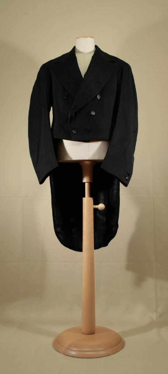 Giacca in panno nero doppiopetto, con collo con risvolti a lancia con occhielli, allacciatura con sei bottoni e altrettanti occhielli, inoltre è presente un bottone gemello; taglio in vita da cui parte la falda che continua posteriormente con la foggia "a coda di rondine", unendosi sul dorso contraddistinto da tagli, che celano una tasca, e dalla cucitura centrale con spacco; due bottoni segnano il punto vita. Maniche in due pezzi con polso con spacco e due bottini. Tasca interna a filetto. Fodera in diagonale di seta nera e per le maniche in diagonale di cotone bianco stampato a righe. Sulla fodera, sul dorso, è cucita l'etichetta molto danneggiata.
