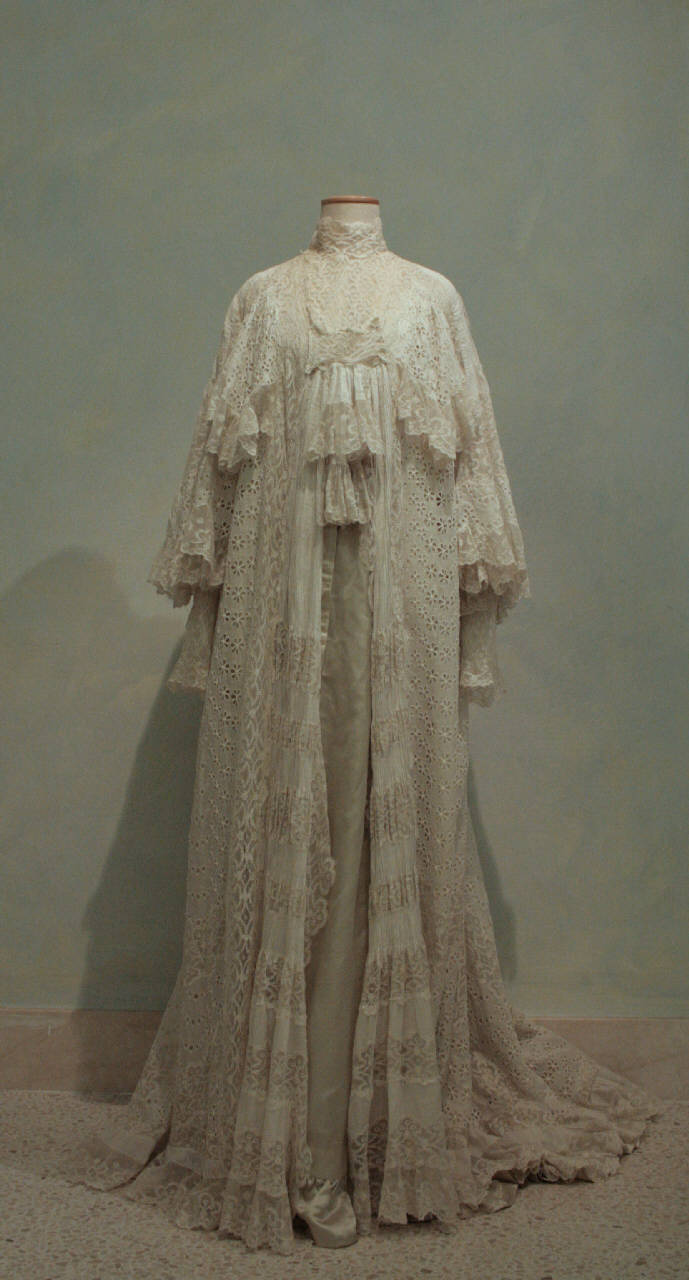Ampia veste da camera in pizzo San Gallo e merletto meccanico, pverovvista sul retro di un piccolo strascico. Lungo l'apertura anteriore due pannelli di tela pieghettata, con falsature in pizzo, sormontati da una doppia gala a ventaglio. Pettorina terminante con colletto alto chiuso sul dietro. Le maniche sono celate da ampie soprammaniche a volants in pizzo San Gallo. La veste è cucita sopra una sottoveste in raso verde acqua, bordata lungo l'orlo da un volants. Sul dorso è cucita una etichetta che riporta il nome "Redfern"