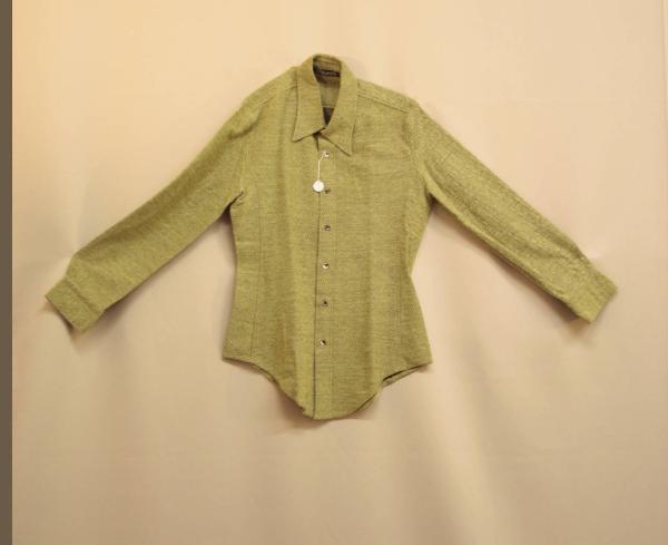 Camicia di linea aderente in jersey operato con effetto canestro, color verde acido. Collo a camicia con punte lunghe, apertura con sette bottoni , maniche lunghe con polsino a 1 bottone. Davanti in quattro pezzi, dietro in tre, con fianchette. Falde arrotondate. Etichetta con nome del produttore, all'interno, sul collo. Sulla cucitura del fianco etichetta "IV".