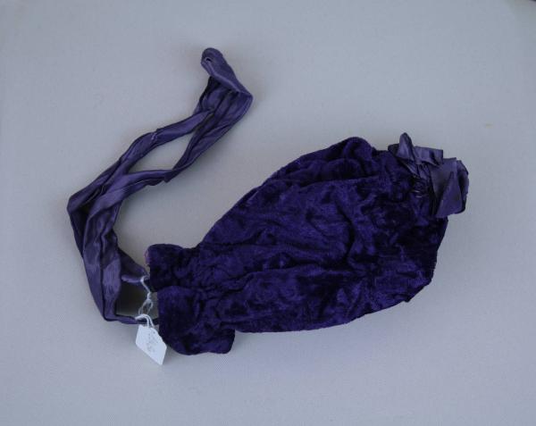 Borsa a sacchetto in velluto viola tagliato ad un corpo, con fodera in raso rosa e manico definito da un nasto viola.