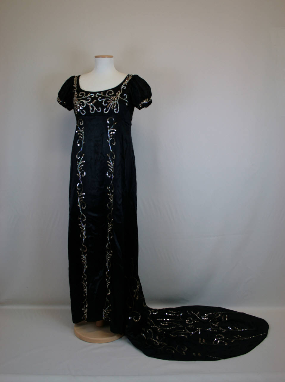 Abito impero, con scollo rotondo con coulisse, maniche corte a palloncino, lungo sino a terra anteriormente e con lungo strascico posteriormente, con piccolo cappio atto a rialzare la coda. Sul corpino, sul bordo delle maniche, sull'abito e sullo strascico è ricamato un girale stilizzato eseguito a ricamo con paillettes (sia trasparenti che dorate), perline e cordoncino dorato. Fodera in taffetas nero, bustino foderato in taffetas bianco. Abbottonatura asimmetrica sul dorso, definita da ganci e automatici.