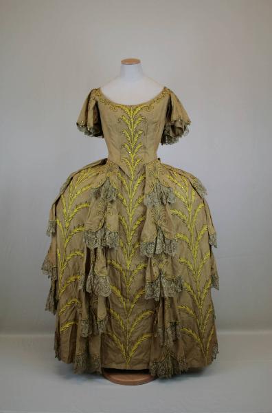 Abito in un pezzo, confezionato in taffetas senape, corpino sagomato da pinces, con scollo rotondo, manica dritta corta sovrapposta ad una aletta, vita tagliata a punta, dove si unisce la gonna modellata per essere appoggiata su un panier (citato nell'inventario); anteriormente, posteriormente e sui fianchi sono applicati pannelli svasati in taffetas, con l'orlo sagomato impreziosito da una gala in pizzo in oro filato, decorato con motivi floreali stilizzati, che ritorna anche sulle maniche. Il corpino, anteriormente e la gonna sono ulteriormente impreziositi da un tralcio stilizzato ricamato in seta gialla, oro filato e illuminato da strass. Bustino foderato in taffetas di seta avorio. Allacciatura sulla cucitura centrale posteriore del corpino, definita da sette ganci.