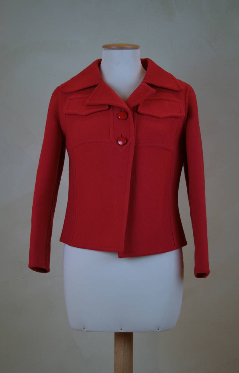 Giacca in panno rosso, con ampio collo con risvolto, busto decorato con tagli funzionali che creano anche una finta tasca applicata con patta sagomata e un motivo a freccia che sottolinea l'abbottonatura definita da due bottoni; fianchetta e taglio sul dorso. Manica dritta lunga in un pezzo. Etichetta cucita su rovescio, privo di fodera.
