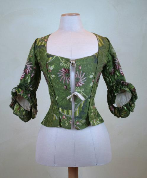 corpino aderente, in gros verde decorato da grandi fiori in seta policroma e argento lamellare, motivi di controfondo realizzati con la slegatura della trama di fondo. Davanti in 2 pezzi, con cucitura all'altezza del seno, chiusura al centro anteriore definita da due coppie di fettucce in cotone. Dorso in 2 pezzi e fianchette, modeste falde aperte. Ampio scollo quadrato, linea delle spalle spostata sul dietro. Maniche a tre quarti leggermente arricciata sulla pala, con parte finale impreziosita da due volant. Doppiato in tela naturale.