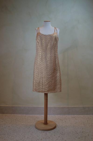 Completo costituito da giacca, abito e blusa. Giacca e abito confezionati in un tessuto lamè matelassè operato a motivi a zig-zag; fodera in taffetas bianco. Giacca monopetto chiusa da tre bottoni, collo con risvolto, maniche a tre quarti. Abito corto al ginocchio con scollo a sottabito sagomato con due coppie di spallini, linea aderente grazie a pinces e tagli; chiusura sul fianco sinistro mediante una zip. Blusa corta ai fianchi in taffetas e organza color crema, colletto a cinturino, modellata da pinces, maniche a tre quarti blusanti con polsino con bottone. Chiusura posteriore definita da sette automatici; sei bottoni non funzionali.