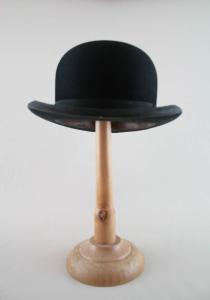 Bombetta in feltro nero, cinturino in gros nero, impiegato anche per bordare la tesa sollevata; fodera in raso avorio su cui è impresso il marchio; giro d'entrata percorso da alta fascia interna in pelle su cui è impresso il marchio.