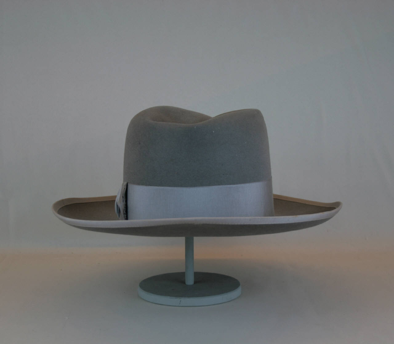 Cappello in feltro grigio, tesa dritta con bordo rifinito con un nastro in gros grigio, impiegato anche per il cinturino della cupola incavata nella sua lunghezza; alto nastro in pelle sul giro d'entrata su cui è impresso il marchio. Fodera in raso bianco su cui è stampato il marchio.
