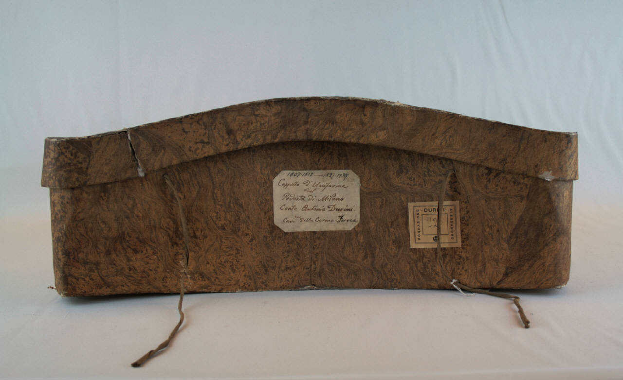Scatola con coperchio ad incastro sagomata a foggia di bicorno, in cartone, rivestita esteriormente in carta marmorizzata nelle tonalità del marrone, e internamente in carta. Sull'esterno sono state incollate due etichette; all'interno una. Chiusura data da fettucce in cotone.