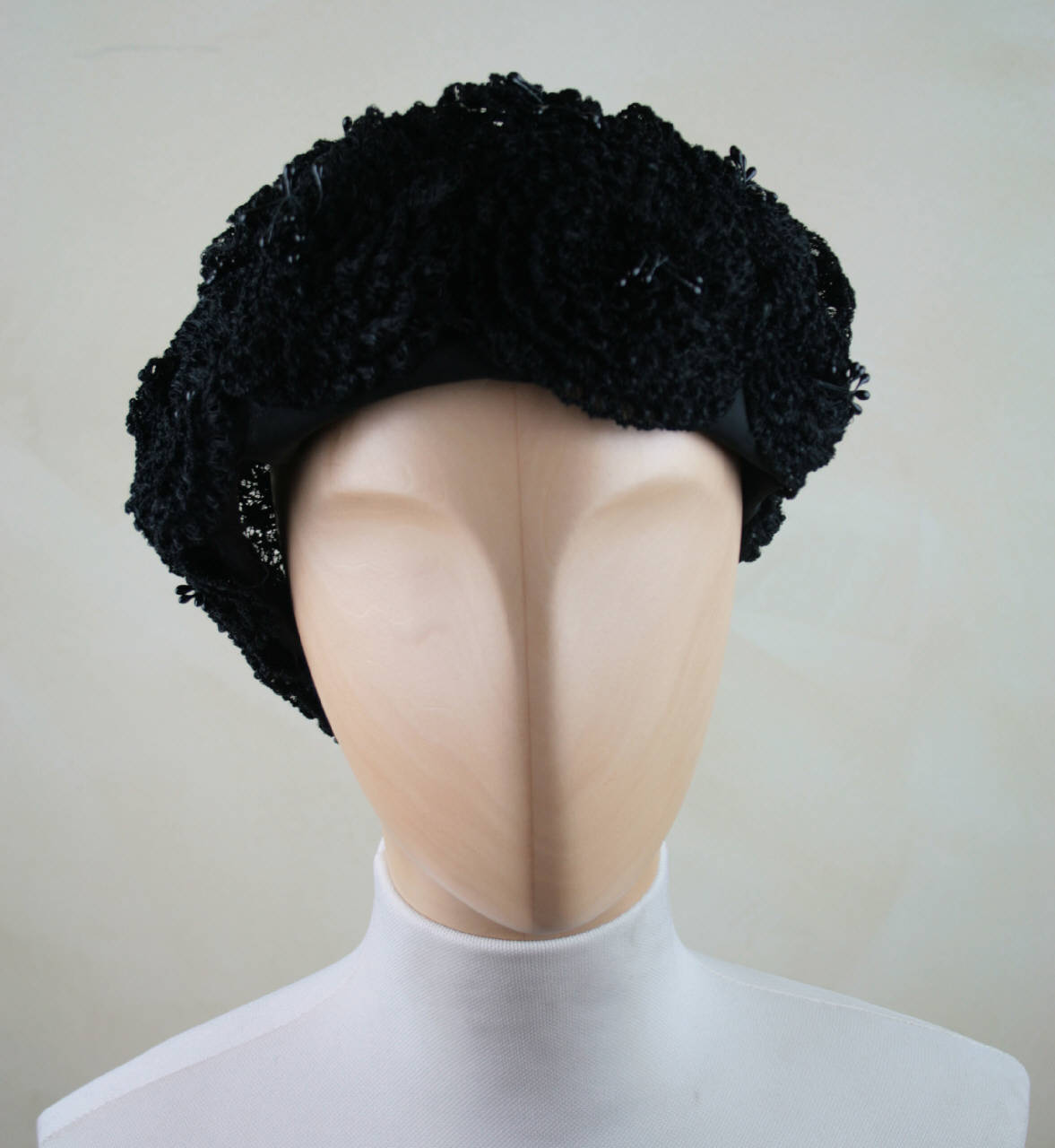 Cappello con cupola arrotondata in tulle, bordato di organza nera e ricoperto da fiori realizzati in merletto nero.