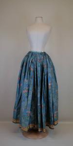 Gonna lunga, confezionata con otto pannelli di gros broccato: sul fondo azzurro si staglia un meandro definito da un merletto bianco, da cui si originano tralci fioriti e fronzuti; il decoro è dato da trame in seta policroma. Cintura in taffetas azzurro, chiusa posteriormente, in corrispondenza dell' apertura della gonna; vita mossa da numerose pieghe aperte; sull'orlo scorre un nastro in raso di seta rigato giallo e rosso, decorato da un sinuoso tralcio fiorito.L'orlo è rifinito con un nasto di tela di lino ceruleo.