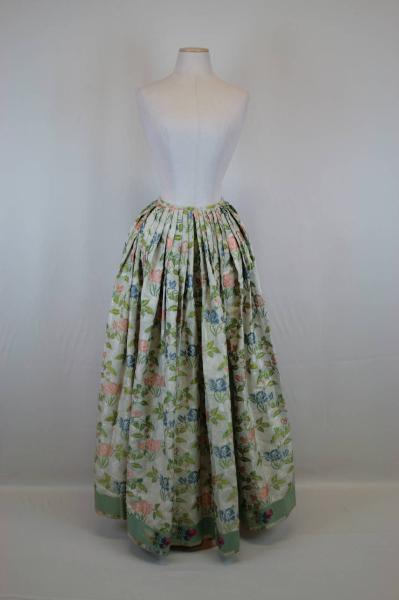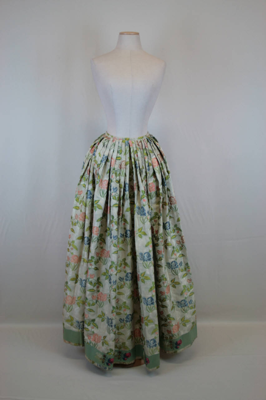 Gonna confezionataa unendo, in senso ordito, 7 teli in gros liseré broccato: sul fondo (creato da orditi bianchi e trame alternativamente verdi e bianche) si dispongono tralci di rose che si intrecciano a sinuosi tralci di pizzo, il decoro è dato sia dalla slegatura delle trame di fondo e sia dalle trame broccate in seta policroma. Piccola cintura a nastro, anteriormente la gonna è mossa da numerose pieghe piatte, posteriormente, dove al centro è l'apertura, è liscia. L'orlo è percorso da un nastro in taffetas verde su cui si stagliano piccoli boccioli di rosa, ottenute da trame supplementari.