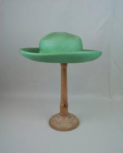 Breton realizzato in paglia verde intrecciata. Calotta rotonda con cinta in jersey verde; l'interno è doppiato in tulle bianco; nastro in taffetas sintetico bianco sul giro d'entrata su cui è cucita l'etichetta e un pettinino per trattenere il copricapo.