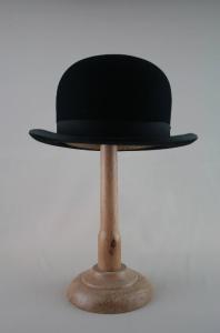 Bombetta in feltro nero, cinturino in gros nero, impiegato anche per bordare la tesa sollevata; fodera in taffetas avorio su cui è impresso il marchio; giro d'entrata percorso da alta fascia in pelle.