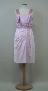 Completo composto da giacca e abito in taffetas effetto gros de Tour sintetico marezzato rosa e in raso di seta rosa. Giacca con abbottonatura drappeggiata doppiopetto, chiusa da sei automatici, e orlo asimmetrico, scollo sagomato e ampie spalle sostenute da spalline; maniche dritte con spacco al polso; lo scollo e l'abbottonatura sono bordati in raso, impiegato anche per creare due fiocchi posti sull'abbottonatura; fodera in raso. Abito che simula un corpino in raso, con collo totale dritto sorretto da due larghe spalline, e gonna con drappeggio in marezzato che imita il modello a portafoglio, con un bordo in raso; chiusura sul dorso, al centro, mediante zip. L'abito è doppiato in organza di seta bianca e foderato in taffetas sintetico bianco. Nastro stringi vita. Completa l'insieme una acconciatura in raso e organza di seta che crea un fiore stilizzato.