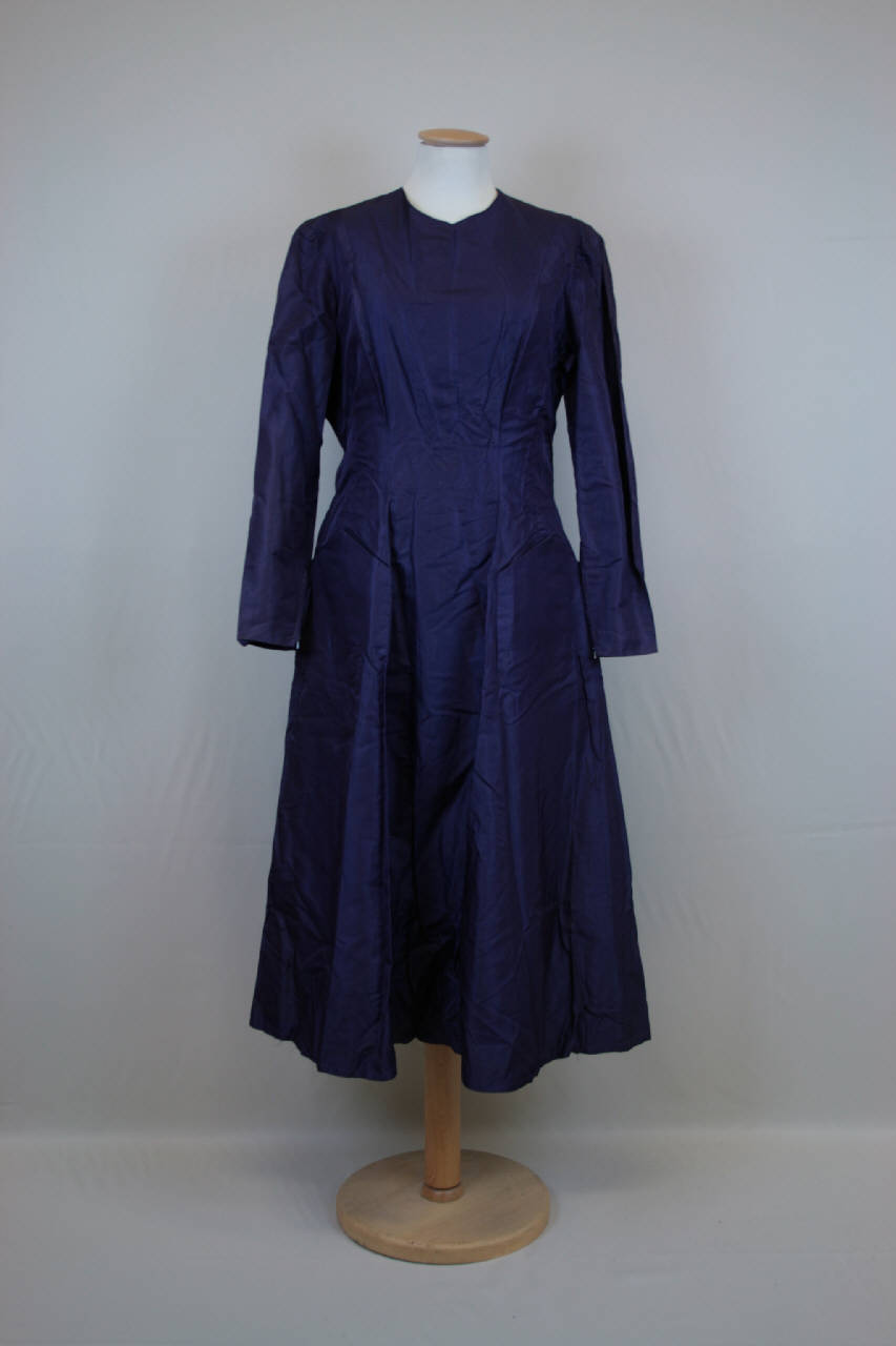 Abito princesse lungo sotto il ginocchio, in taffetas blu, scollo a girocollo, modellato anche da pinces, con tasca sagomata ricavata dal pannello laterale fra la cucitura del fianco e il taglio verticale in lunghezza, dorso con tagli e pinces, con cucitura centrale che accoglie l'abbottonatuta parziale creata da 8 bottoni rivestiti in tessuto e altrettanti occhielli; maniche lunghe dritte modellate da due pinces al gomito e con cernieranella parte terminale. Doppiato parzialmente in tulle blu.
