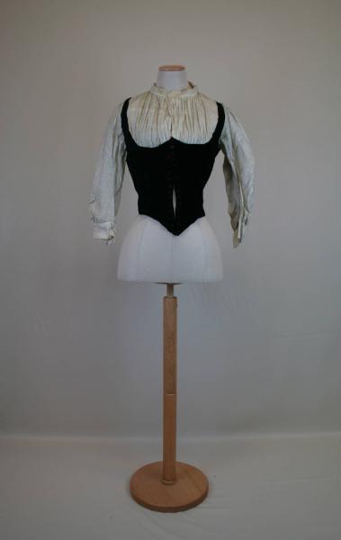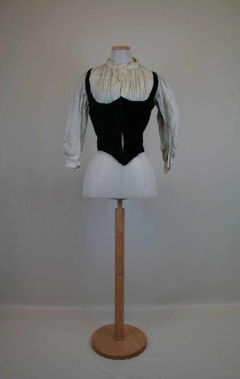 Corpino aderente in velluto blu tagliato, modellato da pinces, scollo ovale, dorso con fianchetta, tagli e cucitura al centro del dorso, punta, sia anteriore che posteriore, che scende oltre la vita. Guimpe in tela di lino avorio con colletto a cinturino e fittamente arricciato; maniche in un pezzo, a tre quarti, in tela di lino arricciate e blusanti, con polsino. La chiusura è data da occhielli circolari (30) disposti sul corpino, al centro anteriore. Orlo rifinito internamente da una banda in tela di lino.