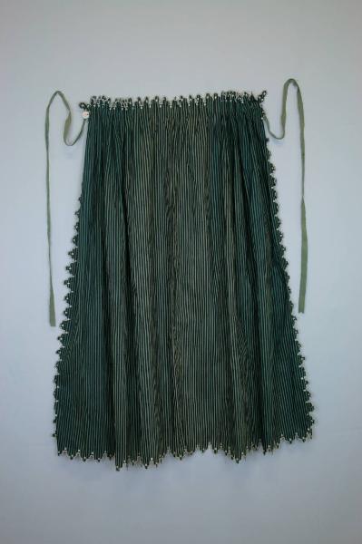 Grembiule realizzato in tela di cotone stampato a righe nere e verdi, cintura creata con una fettuccia di cotone che trattiene anche l'arricciatura in vita del pannello, con orlo smerlato, rifinito da un ricamo a punta asola e decorato da piccoli pois eseguiti a punto pieno.