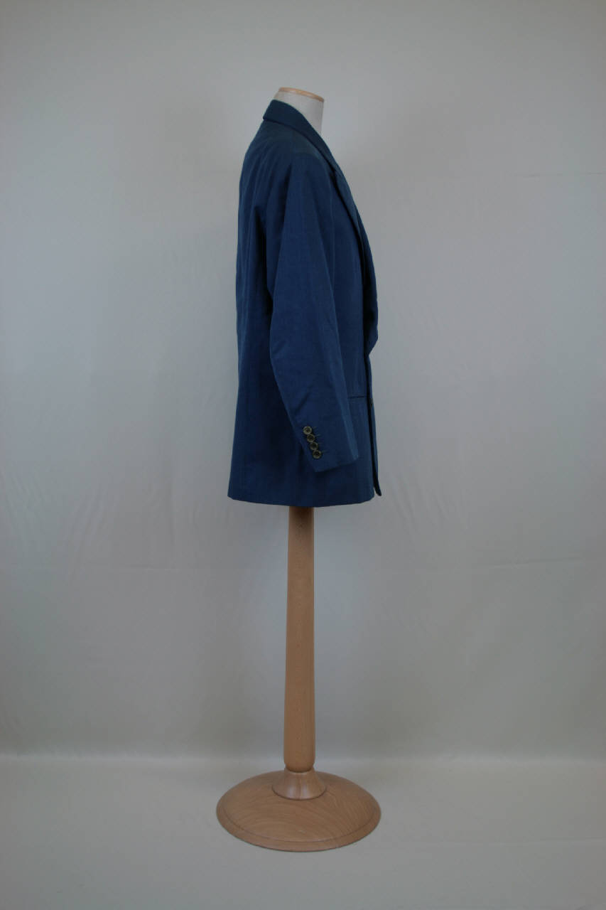 Completo in diagonale di lana color avio, composto da giacca e pantaloni. Giacca doppiopetto,4 bottoni, collo con risvolti a lancia con occhiello, due tasche a filetto e una con patta cucita, modellata da pinces; dorso con cucitura centrale; maniche in due pezzi con spacco sulla manica con quattro bottoni e altrettanti occhielli. Tasca interna a filetto, dove è posta l'etichetta, fodera in diagonale blu che non interessa il dorso e in taffetas bianco rigato per le maniche. Pantaloni lunghi classici, con risvolto, vita con cintura con passanti e spacco sul retro, quattro pieghe aperte ,chiusura nascosta mediante patta dove sono quattro bottoni e altrettanti occhielli, un altro bottone è all'altezza della vita, una tasca sul lato sinistro, sotto la cintura, tasche inserite nella cucitura dei fianchi; sul dorso pinces chiuse e due tasche a filetto con bottoni. Sul rovescio, all'altezza della vita, foderata in diagonale grigio, sono applicati sei bottoni e, sulla fodera della tasca in tela di cotone, l'etichetta.