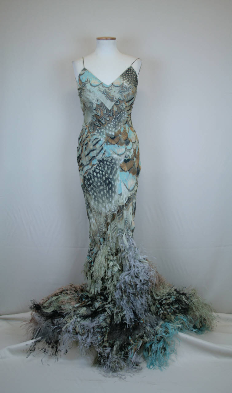 Abito lungo confezionato in raso molto sottile stampato con motivi di piume con scollo a sottabito e sottilissimi spallini, taglio ad andamento triangolare sotto il seno, sotto i fianchi parte un taglio obliquo a cui si unisce, ad intervalli regolari, la parte inferiore dell'abito assai svasata, con strascico, completamente ricoperta di piume di gallo e struzzo, doppiato in tulle bianco, sul cui orlo corre una gala arricciata in raso stampato impreziosito da piume e frange ottenute tagliando il tessuto principale. Sul dorso al centro, è posta la zip.