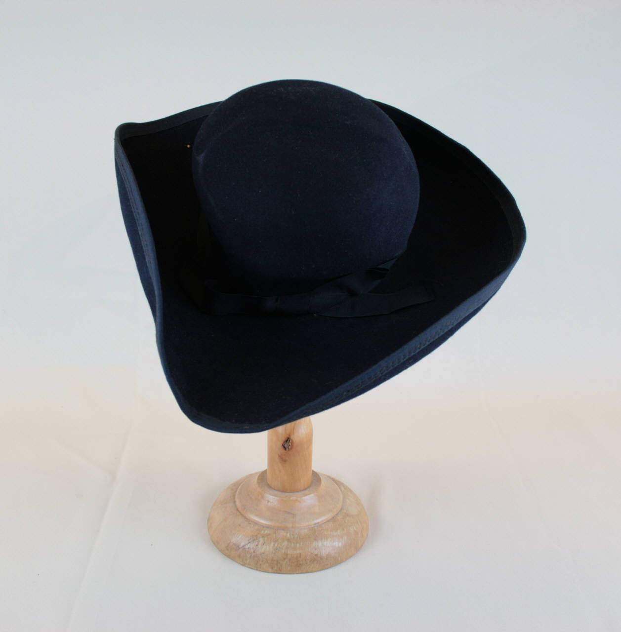 Tricorno in feltro blu, calotta bombata su cui si solleva la tesa, bordata in gros blu, formando i tre spicchi; cinta in gros blu. Al giro d'etrata è applicata un alto nastro in raso blu. Sulla calotta, sul rovescio, è stampato il marchio.