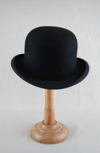 Bombetta in feltro nero, cinturino in gros nero, impiegato anche per bordare la tesa sollevata; fodera in raso avorio su cui è impresso il marchio; giro d'entrata percorso da alta fascia interna in pelle su cui è impresso il marchio e attaccata l'etichetta colla misura (5 1/2).