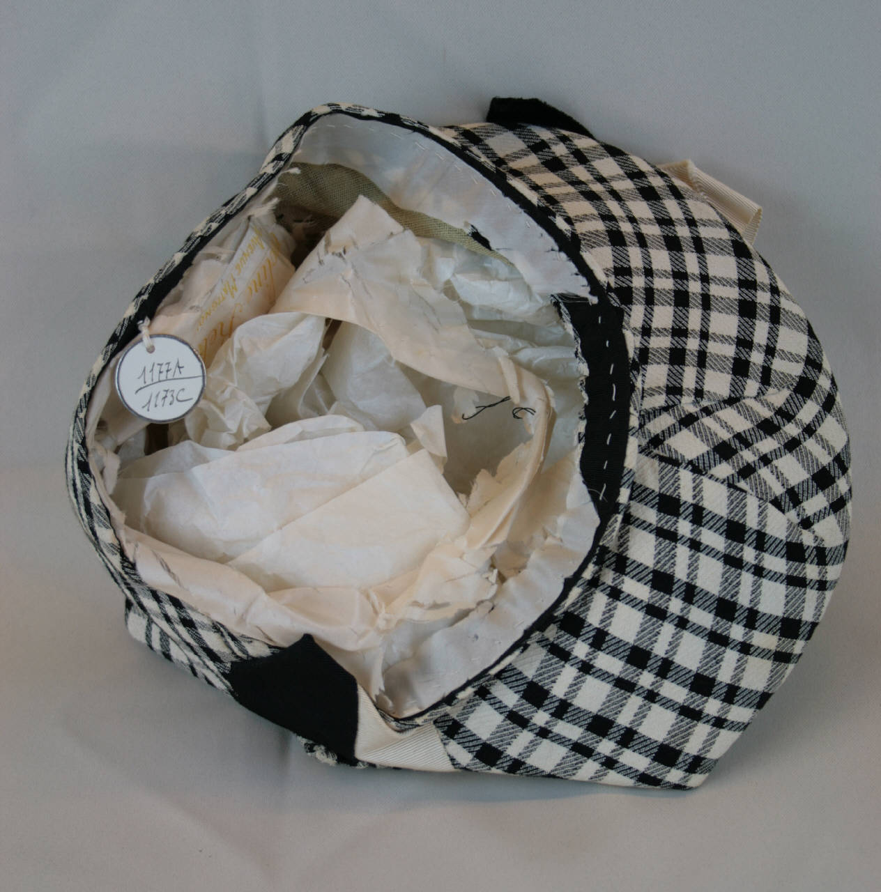 Basco in diagonale di cotone quadrettato (ordito e trama bianca e nero), supportato da tela di cotone avorio molto rada, con cupola rotonda decorata da due nastri in gros bianco e nero, a cui si sovrappone una banda, a coda di rondine, nello stesso tessuto del basco, percorso da costine in rilievo. Fodera in taffetas sintetico bianco su cui è cucita l'etichetta.