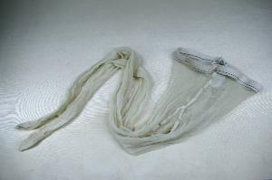 Formato da busto a mezza guaina e gambe in filato sintetico colore avorio molto lucido; elastico al giro vita, avorio con riga azzurra,
