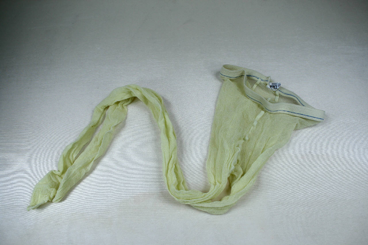 Formato da busto a mezza guaina e gambe in filato sintetico colore giallo molto lucido; elastico al giro vita, avorio con riga azzurra.