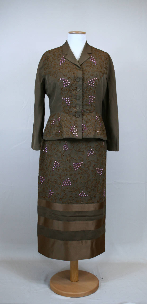 Completo in gros di seta verde salvia ricamato a ramages in cotone a punto catenella e paillettes viola sagomate. Giacca monopetto, chiusura totale definita da 5 bottoni ed altrettanti occhielli; scollo con risvolti diritti, busto sagomato da pinces; maniche lunghe dritte a chimono con tassello; dorso con cucitura centrale e pinces; fodera in raso in tono. Gonna longuette dritta , priva di cinturino, cerniera parziale a sinistra; alto bordo ai fianchi in gros ricamato; la gonna è ritmata da orizzontali bande in raso nocciola intervallate da bande in gros.