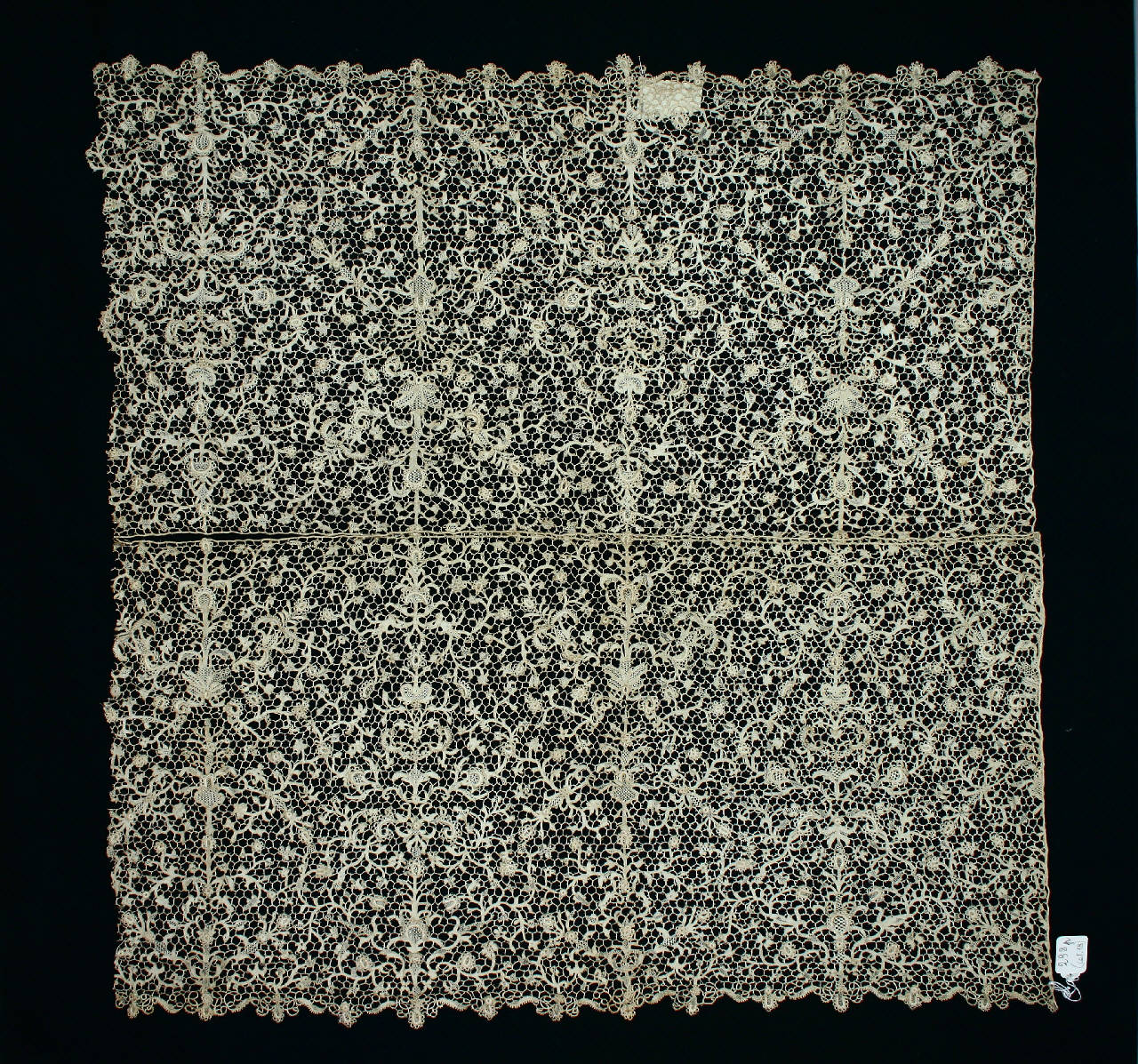 Pannello rettangolare definto cucendo orizzontalmente due bordi identici in lino beige. Ogni bordo è decorato con motivi vegetali stilizzati disposti simmetricamente rispetto all'asse mediana centrale, che si ripiegano in volute e girali che si stagliano su una rete di fondo a maglie irregolari, definite da barrette con picot; i motivi decorativi presentano i bordi anche sottolineati da filati più spessi. l margini superiore e inferiore sono leggermente smerlati e decorati da fiori a ventaglio.