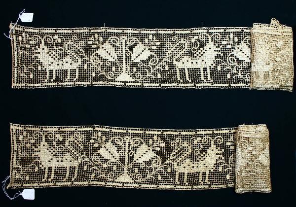 Coppia di bordi in lino avorio in filet ricamato: sulla rete filet si stagliano animali stilizzati intervallati da un ramo stilizzato fiorito. I margini sono sottolineati da un bordo nastriforme.
