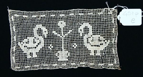 Pannello rettangolare in lino avorio in filet ricamato a punto tela: sulla rete filet si staglia una coppia speculare di cigni, separati da un vaso fiorito. I margini sono sottolineati da un cornicetta definita dalla successione di motivi a chicco di riso.