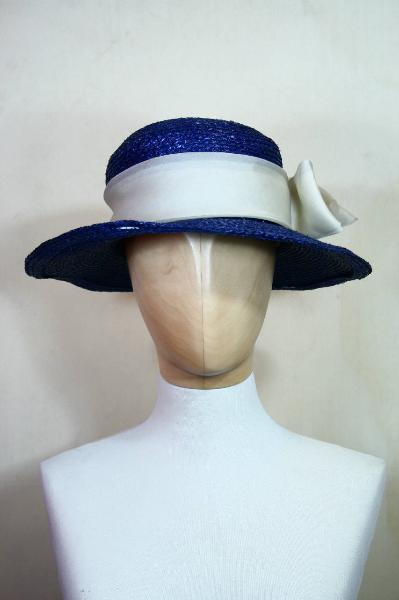 Cappello in paglia blu con calotta arrotondata decorata da alta cinta in organza bianca che crea un fiocco; ampia tesa circolare rigida. Giro d'entrata in velluto e un nastro in cannettato (seta e cotone) blu su cui è cucita l'etichetta.