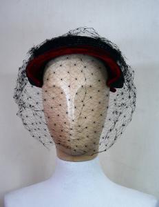 Toque in paglia nera con picola calotta cilindrica a cui si unisce una tesa triangolare, doppiata in velluto rosso, con le punte ripiegate verso il basso; cinta definita da un nastro tubolare in velluto che crea, sul retro, un fiocco; veletta point esprit. Giro d'entrata in cannettato (ordito seta e trama cotone) nero.