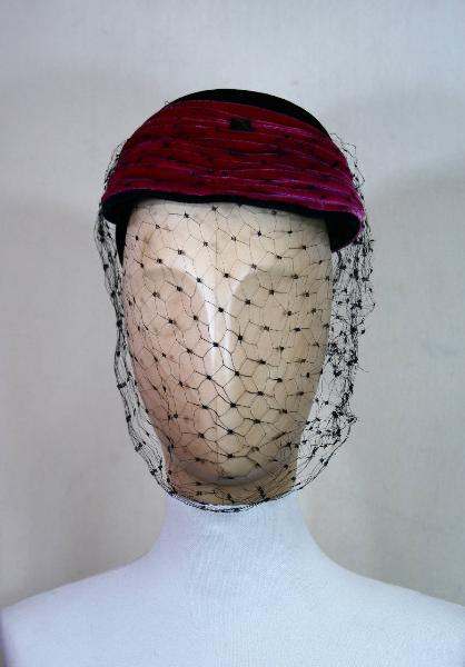 Toque in paglia nera rivestita con velluto nero, sul retro sagomato per accogliere l'acconciatura, e fucsia anteriormente, dove crea un fitto drappeggio su cui è posta una applicazione piramidale nera; veletta point esprit. Giro d'entrata in cannettato (ordito seta e trama cotene) nero.