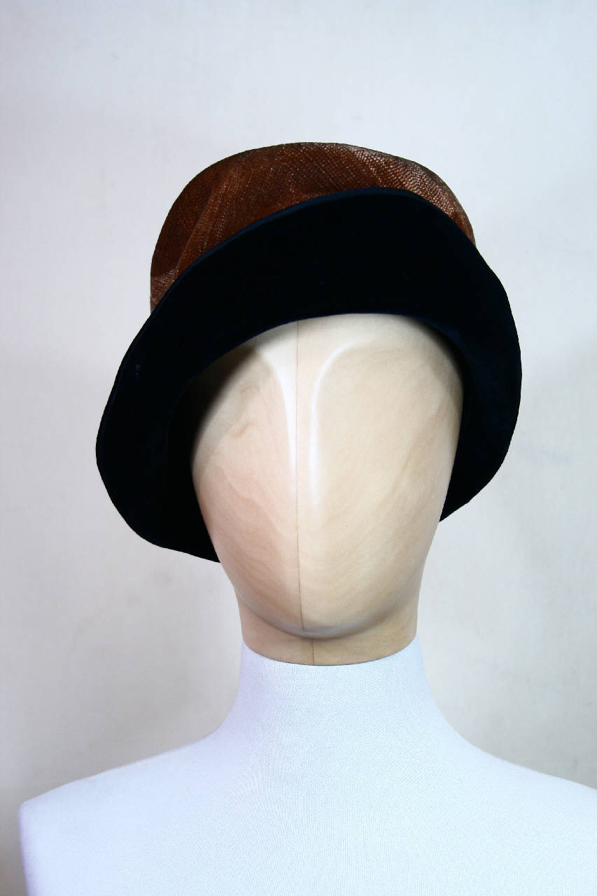 Cappello a cloche con struttura in feltro rivestito in velluto marrone impunturato, alta calotta a campana a spicchi su cui si ripiega, asimmetricamente, la tesa doppiata in velluto nero e bordata in raso nero. Fodera in taffetas nero e giro d'entrata definito da un nastro misto (seta per ordito e cotone per trama) nero, su cui sono applicate l'etichetta con il nome dell'azienda e una fettuccia bianca su cui è impresso "RACHEL".